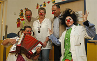 Daniela Ammar und Khaled Ben Ammar überbringen den Erlös ihrer Tombola vom 1. Mai den "Clown-Doktoren". "Dr. Rundkragen" (vorne, rechts) und "Dr. Bohnenstange" nehmen die Spende im Beisein von Kinderklinik-Chefarzt Dr. Bernd Zimmer (hinten, links) entgegen. Foto: Volker Dziemballa